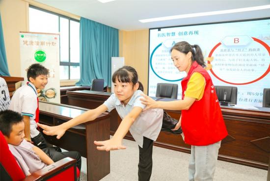 互动体验环节中,志愿者耐心指导学生练习传统养生功法——五禽戏,让他们在模仿虎、鹿、熊、猿、鸟的动作中,体会中医“治未病”的养生智慧。志愿者还介绍了艾灸、刮痧、拔罐等常用中医适宜技术,并细致讲解其作用原理与操作安全要点,引导学生深刻感受中医药的实用价值。