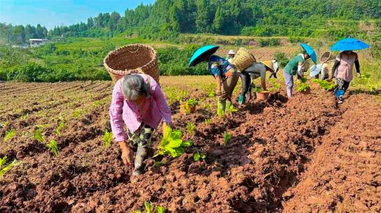 10月10日,米心镇高坎村的田间地头一片热火朝天,拖拉机翻耕后的土地松软平整,十余位村民弯腰忙碌,将儿菜苗整齐地栽入土壤,展现出一派繁忙有序的生产景象。