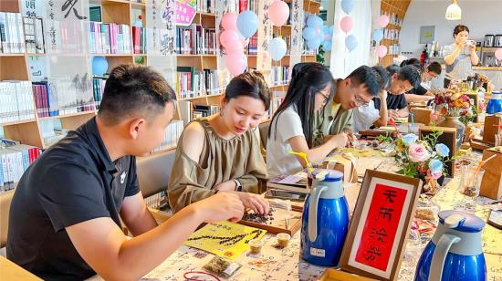 在中药贴画创作环节,青年们两两组队,以木板为底,巧妙运用各种中药材进行艺术创作。创作过程中,一对对搭档细心斟酌药材配色与布局,现场药香弥漫,笑语盈盈。一幅幅蕴含美好祝愿的药材贴画逐渐成型,既展现了青年们的巧思妙手,更在协作中加强了彼此了解,为交友活动增添了独特的文化韵味。大家表示,此次活动形式新颖、内容充实,不仅拓展了社交圈子,更在书香氛围中收获了知识与友谊。