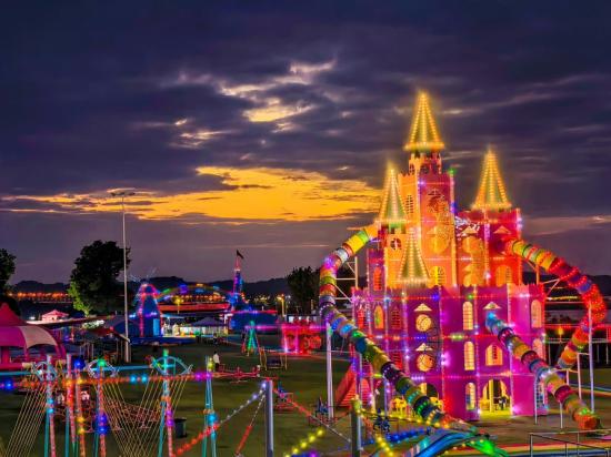 绝美同框!潼城夜空上演梦幻联动,游乐场城堡仿佛沿着霞光攀升,直抵浪漫的顶点。李彦亭 摄