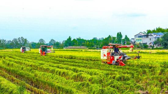 记者在现场看到,连片稻田满目金黄,多台收割机正有序作业,田间地头洋溢着丰收的喜悦。