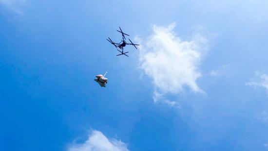 2004年出生的小伙杨晴,手持遥控器,目光专注地盯着不远处的机器。随着他手指的轻巧拨动,这台“空中大力士”吊装着一个鼓囊囊的粮袋,平稳升空,旋即调整姿态,沿着预设的“空中航线”,向农户的家中飞去。不到30秒,它便完成了卸货,自动返航,准备下一次的“投喂”。