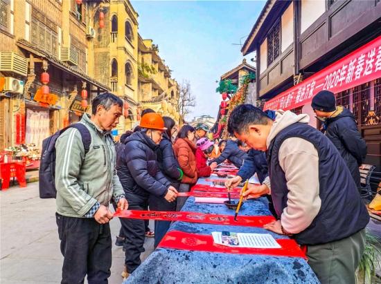 本报讯(记者徐利)春潮涌动启新程,笔墨传情送吉祥。近日,民革潼南区支部、双江镇、区政协诗书影画院在双江镇举行“同心潼行·福进万家——2026年新春送春联”活动,将浓浓的年味和新春祝福送到群众家门口。